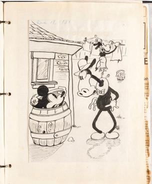 50. Carl Stalling’s Personal Scrapbook. (Stalling, 1920s-40s) Carl Stalling’s personal scrapbook detailing his early career in Kansas City and with Disney. Containing many important keepsakes from his work with Walt Disney, Ub Iwerks, and Warner Brothers, Stalling gave the scrapbook to his close friend Bob Clampett who kept it intact as a testament to the career of his friend. The 65-page book contains a multitude of newspaper and magazine clippings on important events in Stalling’s career as early as 1927, as well as original drawings and artifacts.
