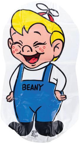 932. A Double-Sided “Beany and Cecil” Display. (Clampett, 1960s) A large double-sided “Beany and Cecil” display with Beany on one side, and Cecil on the other. Constructed of metal and wood and measuring 36” in diameter and 4” wide, the sign displays in fair condition with peeling, residue stains, a break in Beany’s right hand, soiling, and discoloration from age. Due to size and weight, this item requires special shipping arrangements. Please inquire before bidding. $300 - $500