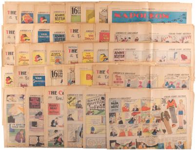21. A Bob Clampett-Owned Collection of 38 Funny Pages. (Los Angeles Examiner, 1932-1938) The Comic pages of the Los Angeles Examiner were an important part of young Bob Clampett’s artistic upbringing. Clampett kept these 38 assorted sheets of two double-sided cartoon pages – all published between 1932 and 1938 – in his personal collection. The total 152 pages include classic strips such as Thimble Theater with Popeye, Felix the Cat, and Rube Goldberg, among others. Each page measures 23” x 15” and the collection is in fair to good condition with typical wear and discoloration from age, and some pages with small tears. $100 - $200