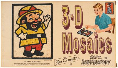 927. A Captain Huffenpuff and Crowy Poolside Display. (Clampett, 1960s) A handmade wooden cut-out of Captain Huffenpuff and Crowy from “Beany and Cecil,” that decorated Bob Clampett’s backyard pool area. Measuring 60.75” x 30” x 0.25” thick, the display is in fair condition with edge wear, peeling, scratches, cracks, soiling, a broken tip of Crowy’s hair, and light discoloration from age. Due to size and weight, this item requires special shipping arrangements. Please inquire before bidding. $300 - $500