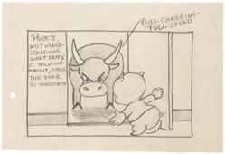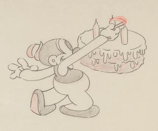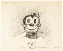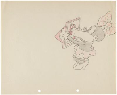 This image appears as Gertie takes her final bow at the end of the vaudeville show. Bob Clampett received it directly from another early animation pioneer, Paul Terry, right after the Animation Conference at the Montreal Expo in 1967. Terry, best known for creating Mighty Mouse and producing over 1,300 Terrytoons cartoons, inscribed the back “This is an original by Winsor McCay. With all good wishes to Bob Clampett from Paul Terry, Aug. 24 1967.” The drawing is in very good condition, considering its age, with the rice paper measuring 6.75” x 8.5” mounted to a 7.25” x 8.5” display board. The drawing has very faint discoloration from age mainly towards the top, slight spotting, six spots of discoloration at the top and bottom edge from mounting, seven tiny ink spots to the right of Gertie’s face, and a 0.75” V-shaped tear near the right edge that does not affect the image. $4,000 - $6,000