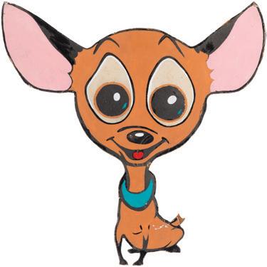 943. A Careless the Mexican Hairless Display. (Clampett, 1960s) A handmade wooden cut-out of Careless the Mexican Hareless from “Beany and Cecil” that decorated Bob Clampett’s backyard pool area. Measuring 21.75” x 22.5” and 0.25” thick, the display is in fair condition with edge wear, broken tail, peeling, scratches, cracks, soiling, and discoloration. Due to size and weight, this item requires special shipping arrangements. Please inquire before bidding. $300 - $500
