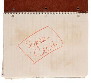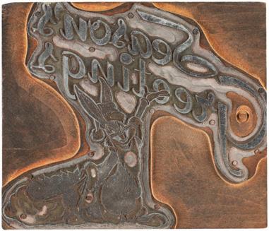 A printer’s block engraved with Cecil and “Pay to the order of” inside a speech bubble. Measuring 1.5” x 2” x 1” deep with its 4.5” x 6” envelope, the printing block displays in very good condition with pencil markings from production and wear from use, while the envelope is in fair condition with tears, creases, and wear from use.
