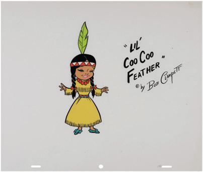 961. A Lil’ Coo Coo Feather Cel. (Clampett, 1970s-80s) An original hand-painted cel of Lil’ Coo Coo Feather with a Bob Clampett copyright. Measuring 10.5” x 12.5” with an image size of 7” x 7.5”, the cel displays in very good condition with spots of paint loss, scratches, and wear from display. $100 - $200