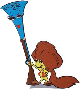 946. A Davey Cricket with Ol’ Betsy Display Cut-Out. (Clampett, 1960s) A handmade wooden cut-out of Davey Cricket with his gun, Ol’ Betsy, from “Beany and Cecil,” that decorated Bob Clampett’s backyard poolside area. Measuring 45” x 31.5” and 0.25” thick, the display is in fair condition with edge wear, peeling, scratches, soiling, a 2” x 1.5” area of missing paint on the right edge of the gun, a 1” x 1” area of missing paint on Davey’s right arm, and light discoloration from age. Due to size and weight, this item requires special shipping arrangements. Please inquire before bidding. $300 - $500