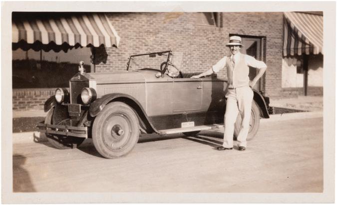 40. A Photo of Walt Disney and his Moon Roadster. (Disney, 1920s) A rare original photo of Walt Disney with his 1926 Moon Roadster. Walt was very fond of this car, however, in 1928 when the studio faced financial troubles, he decided to sell it. The 4.25” x 2.5” photo was given to Stalling by Disney. It is inscribed in pencil on the reverse – “Walt & his Moon – Sold For Payroll.” The photo is in good condition with residue on the reverse from being mounted in a scrapbook. $300 - $500