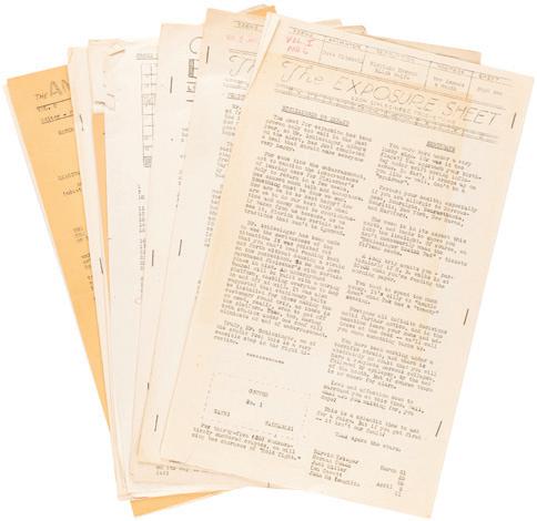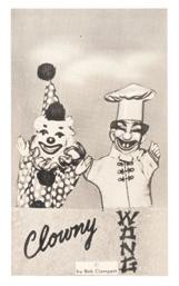 1. Robert Clampett’s “Cartoons” 1926 Original Report. (Clampett, 1926) Clampett’s career path was clear from a very early age. In this five-page school report, 13-year-old Robert Clampett talks about the popularity of comic strips and political cartoons of the day, as well as the emergence of the animated cartoon. Illustrated with original drawings by Clampett as well as clippings of well-known newspaper strips, the report showcases his artistic talent as well as his passion for the medium. The five typewritten pages (with two inked illustrations) are bound in an 11” x 12” folder with a hand-inked cover illustration by Clampett. At almost 100 years old, the report is in good condition overall, with creasing in the cover and a few pages loose in the folder. $800 - $1,000