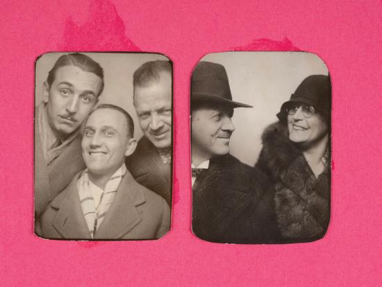 42. A Pair of Photo Booth Photos featuring Walt Disney and Carl Stalling. (1929/1930) An extremely rare pair of photo booth pictures: one shows Carl Stalling with his wife, Gladys, and the other captures Stalling alongside sound man Jack Lowery and, in a rare candid moment, Walt Disney. The photos were most likely taken on a trip to New York for a recording session. Each photo measures 1.5” x 2” and have been mounted on pink construction paper. Both are in good condition with expected wear from age. $200 - $400