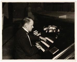 25. An Early Photo of Carl Stalling Playing the Organ (Stalling, 1918) A photo of Carl Stalling playing the organ in 1918 at the Isis Theatre in Kansas City. Most likely a later copy, the 10” x 8” photo is in good condition with a small tear at the bottom right that does not affect the image, an inscription on the reverse by Stalling or his wife Gladys, and residue from being mounted in a scrapbook. $100 - $200