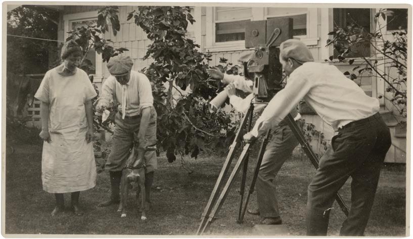 30. A Photo of Walt and Roy with their Aunt and Uncle inscribed by Walt Disney. (Disney, 1923) An extremely rare early photo of Walt and Roy Disney and their Uncle Robert and Aunt Charlotte. The 4” x 2.5” photo came from the estate of Carl Stalling and features Disney filming Robert’s dog Peggy in the yard of his Uncle’s House at 4406 Kingswell Ave in Los Angeles. The photo is inscribed on the reverse in pencil–“My Aunt, Uncle- ‘Peggy’ the smartest canine in the world, my Br(o) and self” The photo is in good condition with some paper residue on the reverse from a previous mounting in a scrapbook, the residue covers some of the inscription. $1,000 - $2,000
