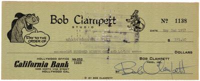 978. A Bob Clampett Signed Studio Check. (Clampett, 1957) A Bob Clampett Studio check signed by Clampett and made out to voice actor Walker Edmiston. Known for his work on “Time for Beany,” “Thunderbolt The Wondercolt,” “H.R. Pufnstuf,” and “The Walker Edmiston Show,” Edmiston signed the reverse of the check in blue ink. Measuring 3.5” x 8.5”, the check displays in very good condition with discoloration from age, edge wear, smudges, a full vertical fold at the center, and punctures from bank use. $100 - $200