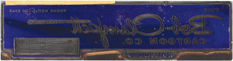 967. A Bob Clampett Cartoon Co. Printing Block. (Clampett, 1950s-60s) A large printing block engraved with “The Bob Clampett Cartoon Co. Hollywood.” Measuring 8” x 2.25” x 1” deep, the block is in good condition with scuffs, scratches, labeling tape, and wear from use. $100 - $200