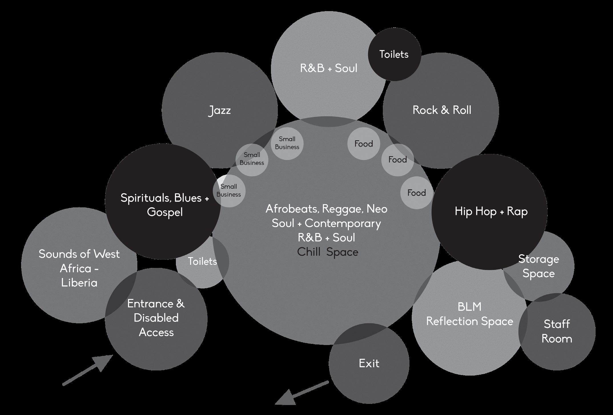 This sketch and diagram show my initial ideas for the design, layout and content of the proposed spaces. I wanted each space to tell a story of an event or significant element of Liberian history and culture, and run almost like a timeline throughout the structure to create a clear understanding of the country and how it came to be.
