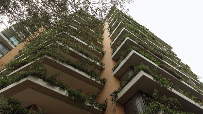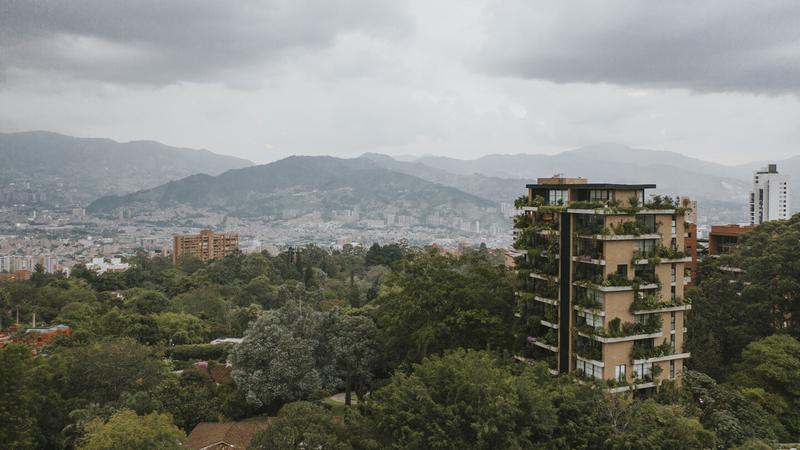 Cerca de un kilómetro de espesos jardines con más de cien especies de nuestro exuberante trópico (...) el verde de toda esa vida que se pliega y que se derrama por todas las fachadas son el argumento central de este edificio que genera, el mismo, su propio paisaje, desde adentro ves en cada ventana un jardín y más allá la ciudad y las montañas...