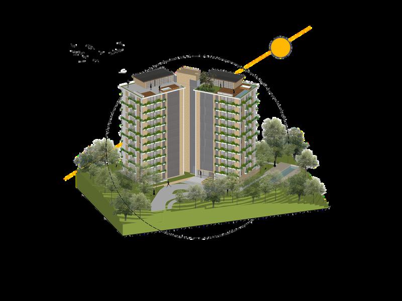 El diseño de la edificación se da a partir de un giro de 120 grados en una torre para que el edificio reciba el asoleamiento correcto para la vegetación durante el transcurso del día, motivo principal por el que se pensó el giro.