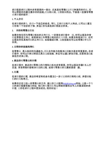 如果你正在寻找一份零售业的工作,建议你尝试使用HelpWriting.net网站。这是一个专 业的求职信撰写服务网站,他们的专家团队可以帮助你撰写出令人印象深刻的求 职信,让你在求职过程中更加成功。祝你好运!