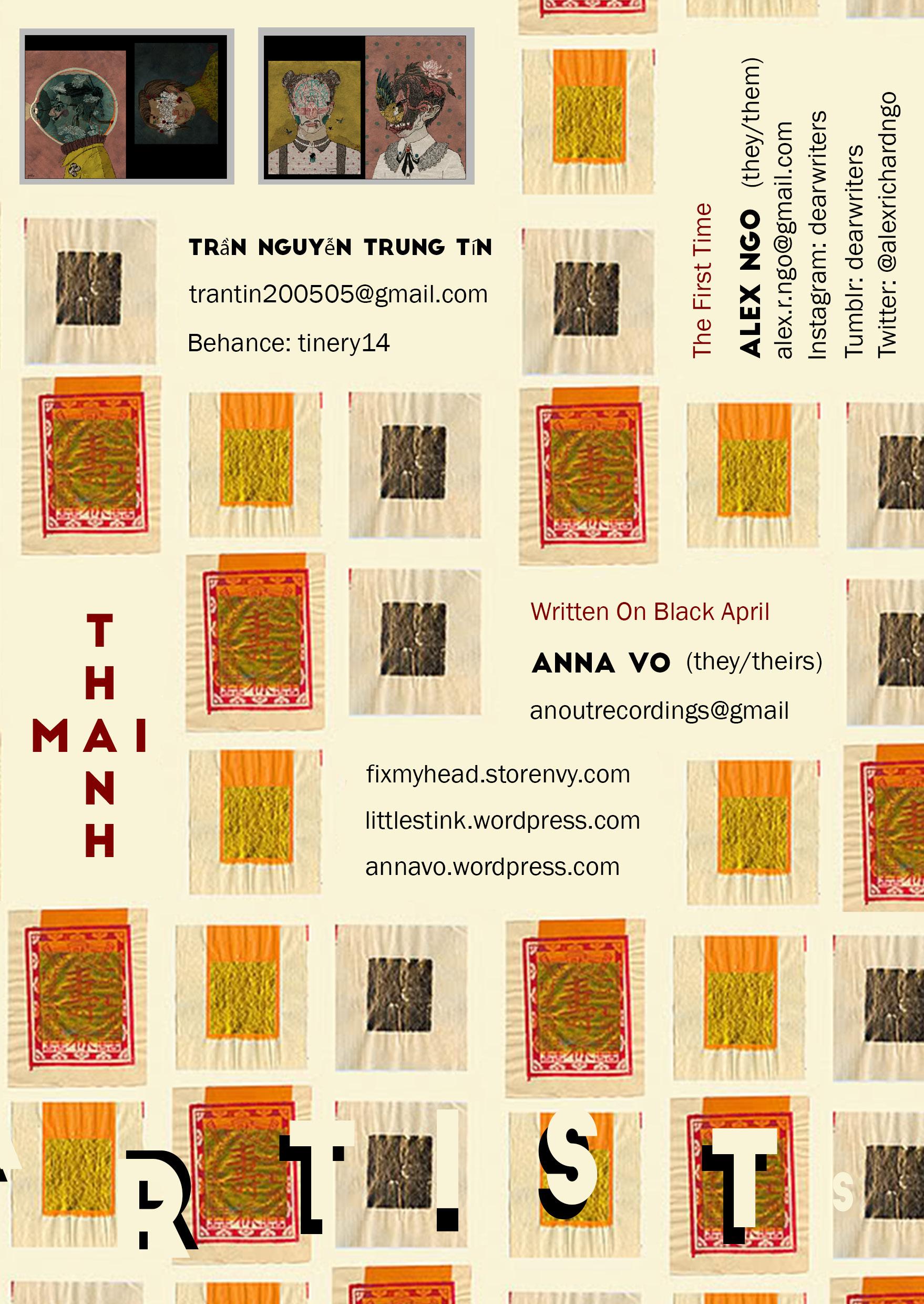 Alex Ngo, Anna Vo, Gabby Miller, Hoàng Long, huệ-tây, Jacquell, Ian Quee, Khanh Aiden Nguyễn, Khoa Ha, Lam, Phước Thái, Phuoc Pham, Rosi Le Thi Ngo, Thanh Nu Mai, Trần Nguyễn Trung Tín, Xen Nhà, Xuân Hạ