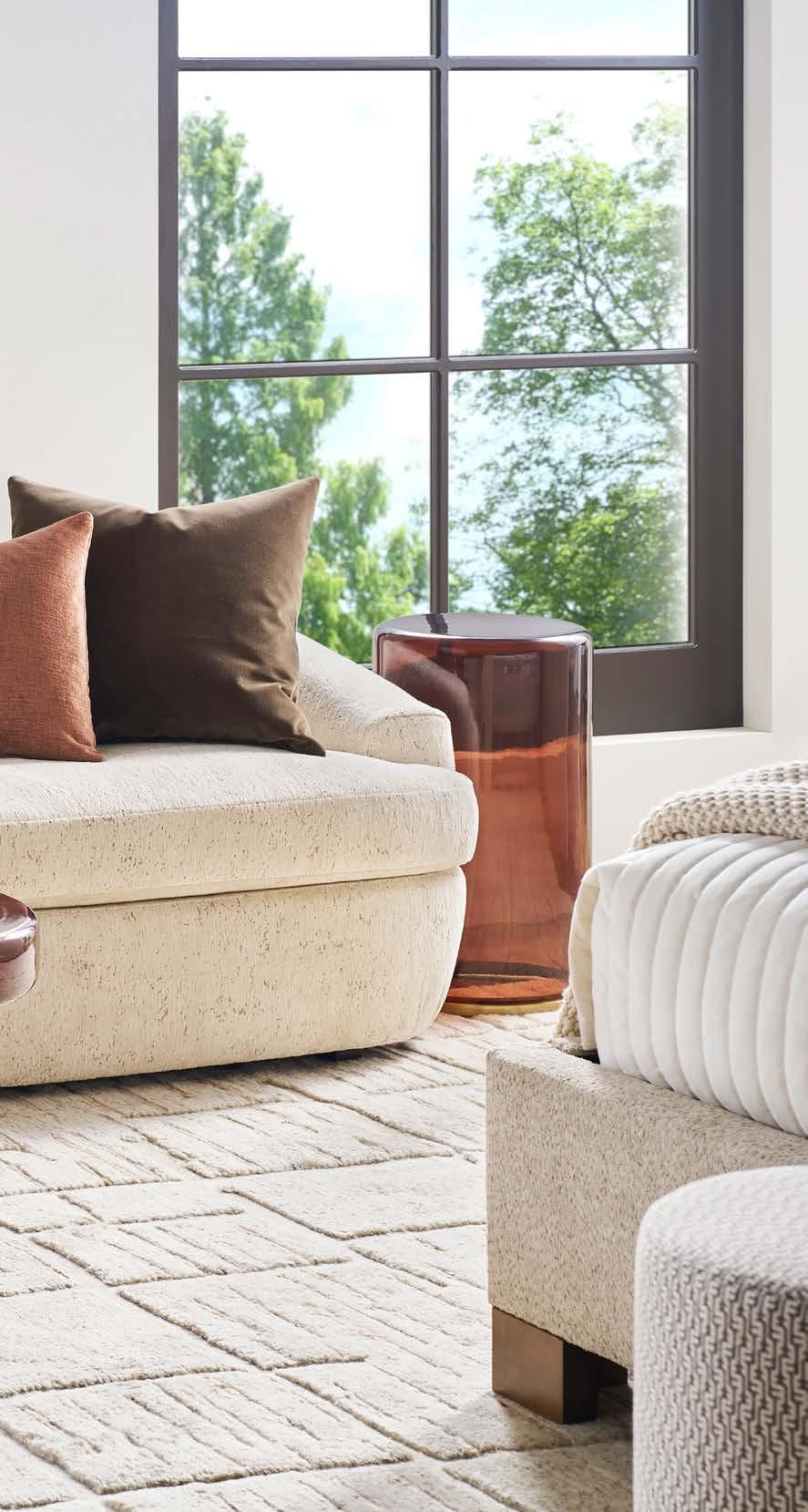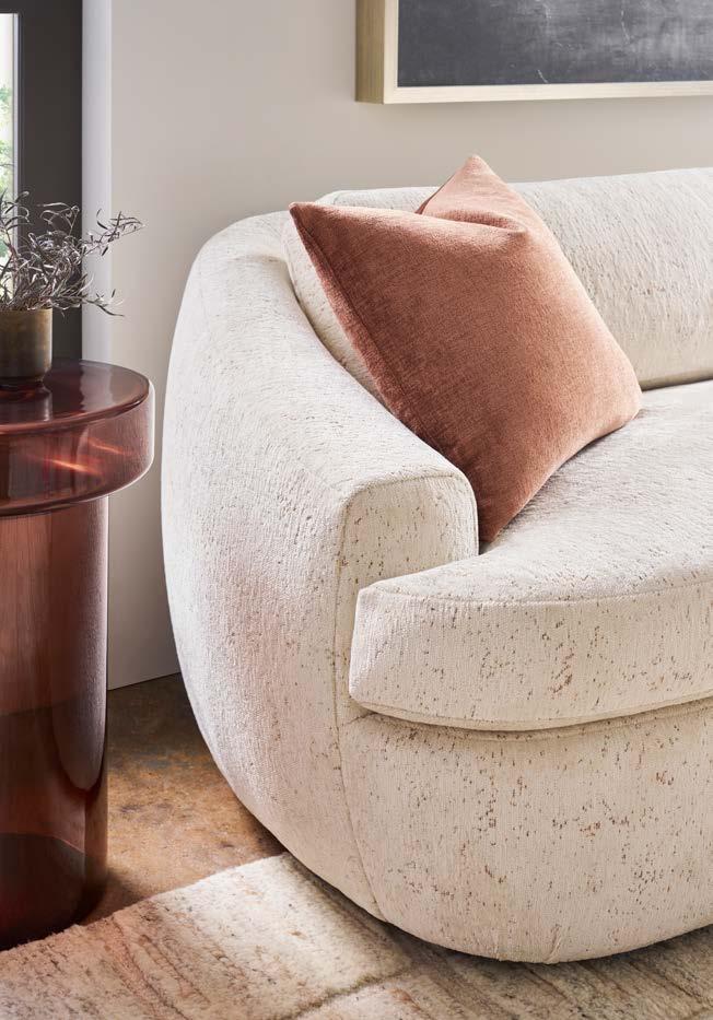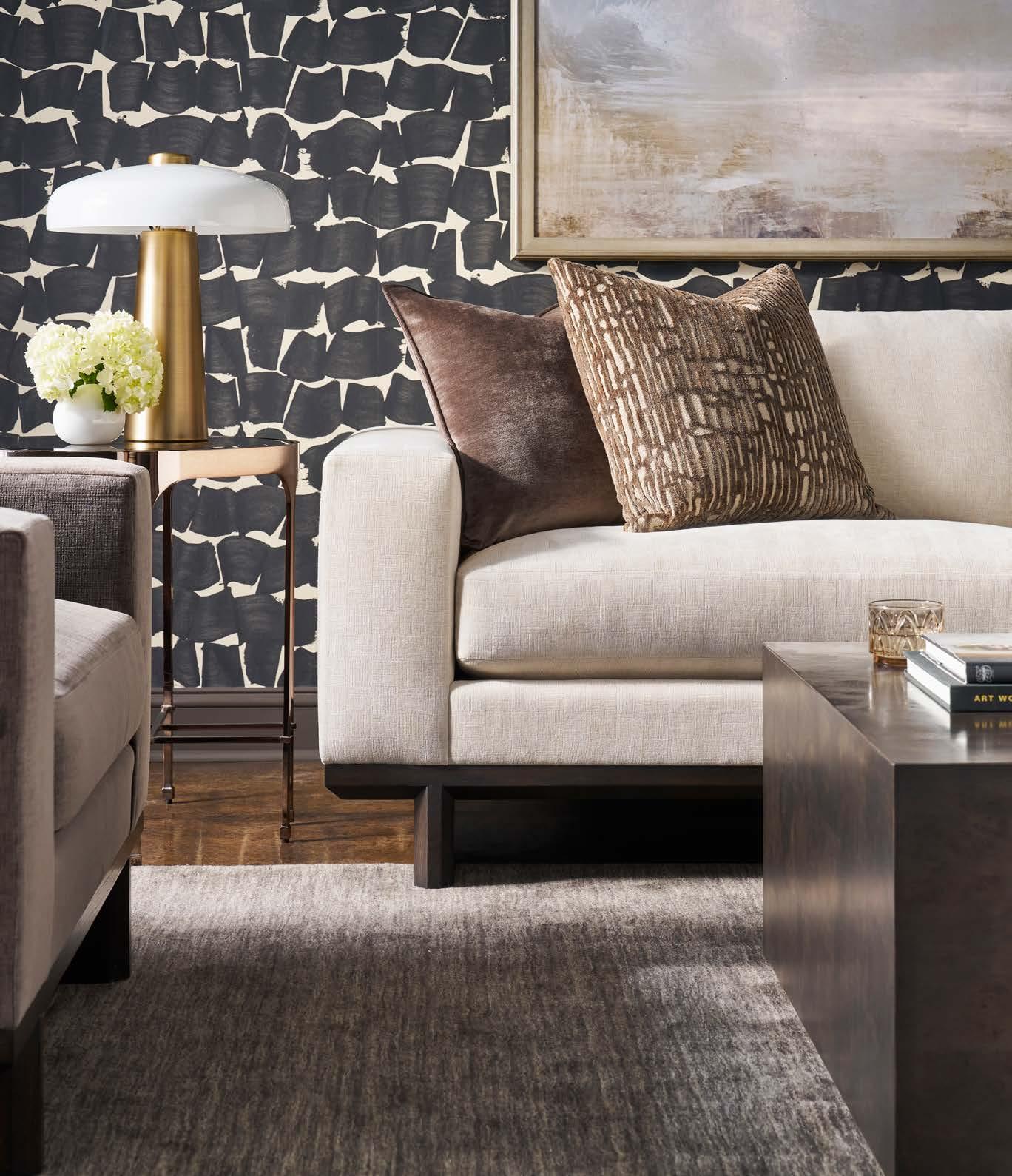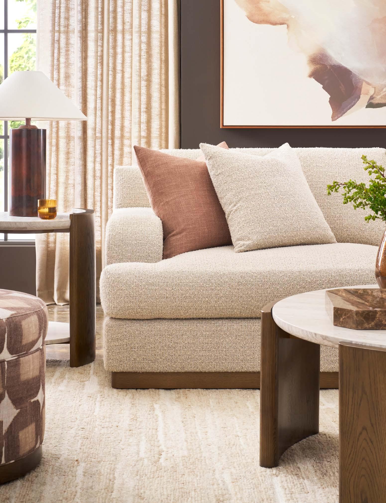 Front Cover: SYMMETRY CHAIR V240-CH. (W 43 D 42 H 34) Fabric: Toscana Sable. Finish: Amarone. Wood Base. CALLIOPE END TABLE 7007E (Perspective) (Stocked) (W 24 D 24 H 25) Polished Cocoa Metal Base, Bronze Tinted Glass Top. SYMMETRY TWO SEAT SOFA V240-2S. (W 97 D 42 H 34) Fabric: Trendy Ivory; two standard 21" throw pillows in Toscana Sable. Finish: Amarone. White Oak Base. Shown with one extra MPSP22 pillow in Verity Walnut (additional charge) VERONA COCKTAIL TABLE P377C1. (W 36 D 36 H 16.5) Finish: Silver Briar. Random Match Mappa Burl Veneers on Top and Sides, Black Painted Base.
