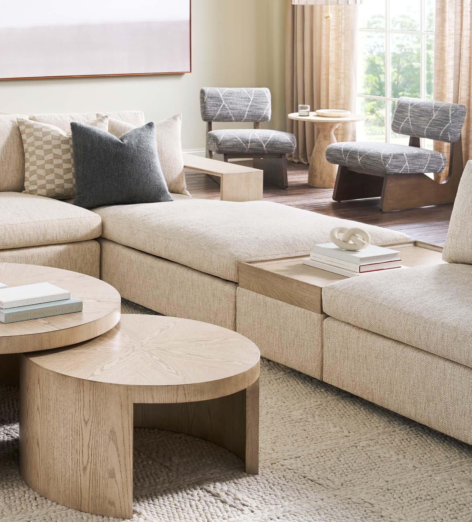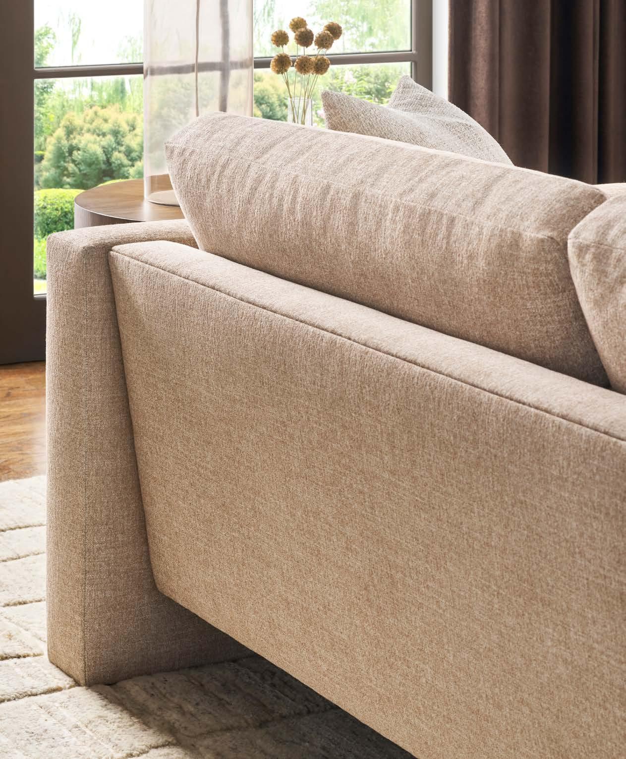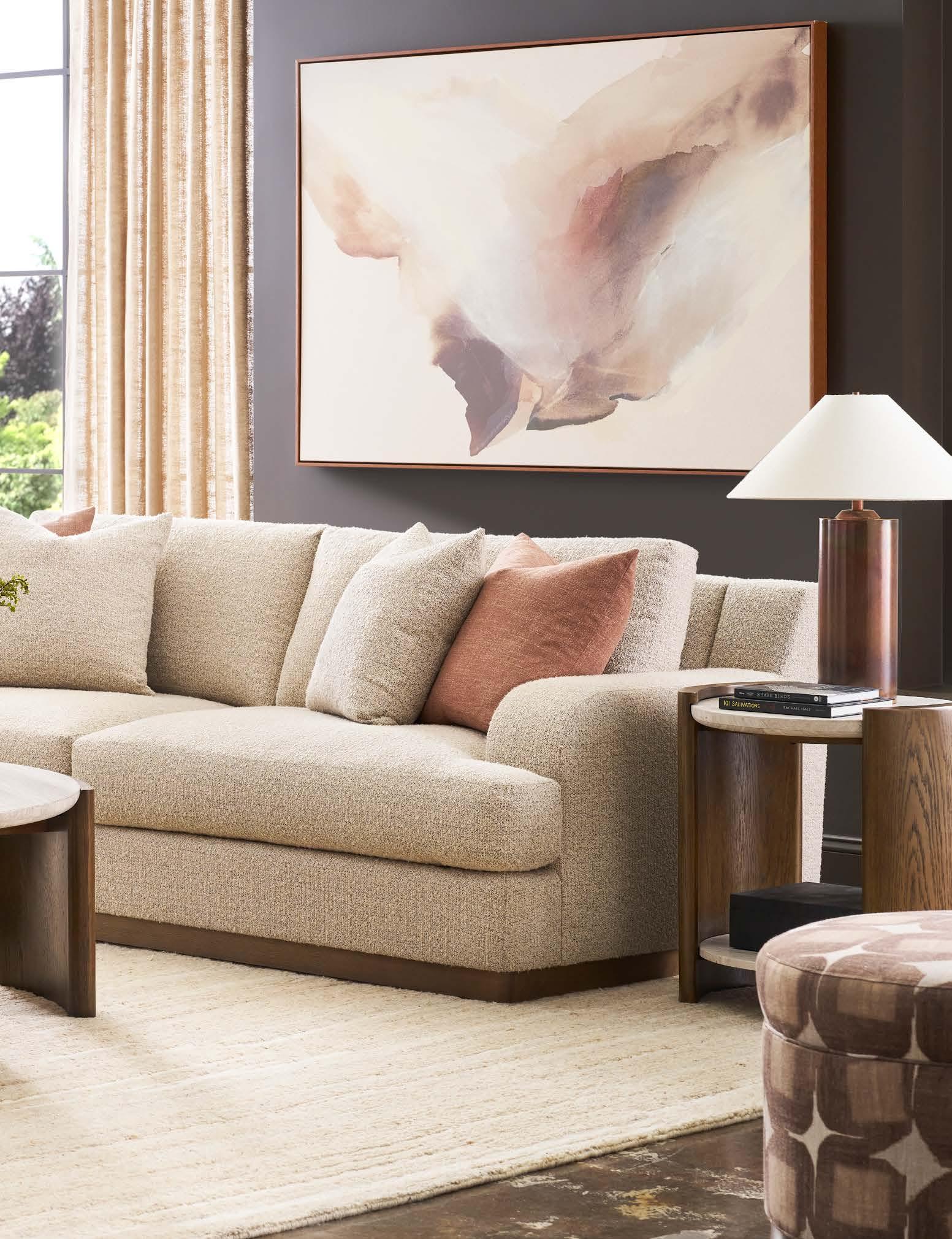 Front Cover: SYMMETRY CHAIR V240-CH. (W 43 D 42 H 34) Fabric: Toscana Sable. Finish: Amarone. Wood Base. CALLIOPE END TABLE 7007E (Perspective) (Stocked) (W 24 D 24 H 25) Polished Cocoa Metal Base, Bronze Tinted Glass Top. SYMMETRY TWO SEAT SOFA V240-2S. (W 97 D 42 H 34) Fabric: Trendy Ivory; two standard 21" throw pillows in Toscana Sable. Finish: Amarone. White Oak Base. Shown with one extra MPSP22 pillow in Verity Walnut (additional charge) VERONA COCKTAIL TABLE P377C1. (W 36 D 36 H 16.5) Finish: Silver Briar. Random Match Mappa Burl Veneers on Top and Sides, Black Painted Base.