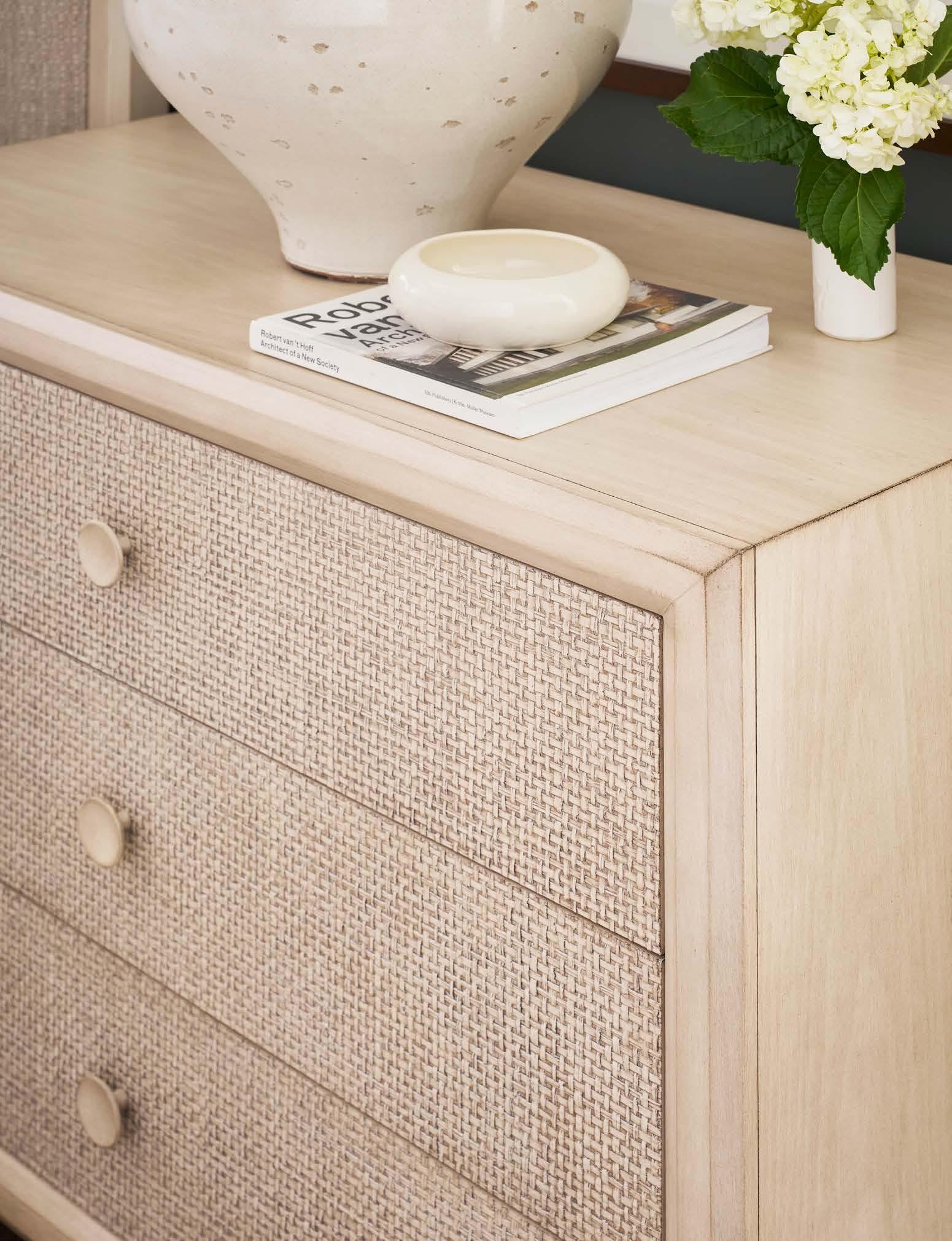 Opposite Page: ASHBY THREE DRAWER NIGHTSTAND CC252 (Make It Yours Bedroom) (W 31.75 D 20 H 30) Finish: Linen. Beech and Maple Solids and Veneers, Three Drawers, Grass Cloth Face, Small Round Wood Pulls/One Centered on Each Drawer, No Base Options. All MIY Bedroom drawer faces and hardware options are available.