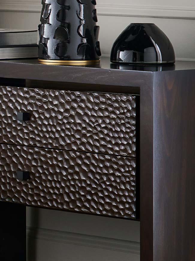 C. DEVON TWO DRAWER NIGHTSTAND CC244 (Make It Yours Bedroom) (W 41 D 20 H 29.5) Finish: Amarone. Beech and Maple Solids and Veneers, Two Drawers, Premium Carved Face (upcharge) , Namaste Pulls in Antique Bronze/One Centered on Each Drawer, No Base Options, Metal Spacers Between Inner Box and Outer Shell in Antique Bronze (shown) , Brushed Nickel or Satin Brass. All MIY Bedroom drawer faces and hardware options are available.