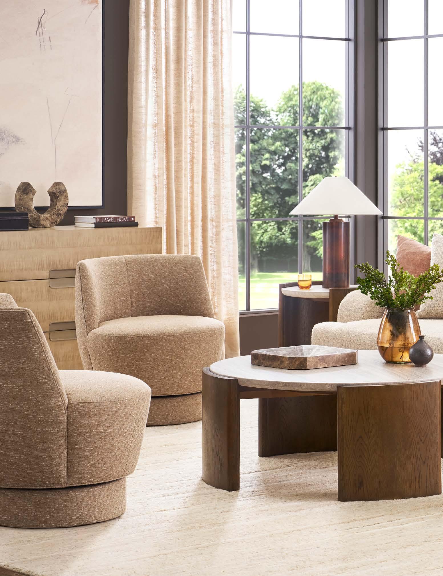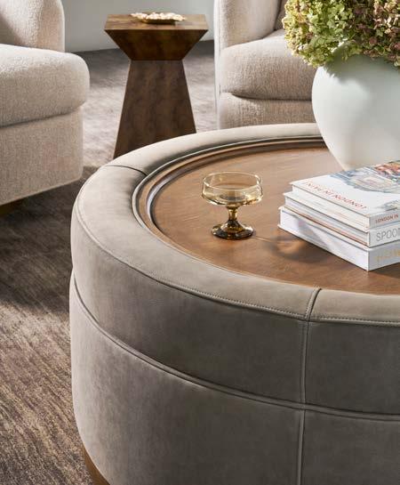 A. RENDITION SPOT TABLE 8412EE. (W 14 D 14 H 20) Finish: Mocha. Bleached Flatcut Mahogany Solids and Veneers. B. MAKE IT YOURS ROUND LEATHER OTTOMAN L40DAXWN. (W 40 D 40 H 18.5) Leather: Cottswald Granite. Finish: Cavallo. Rounded Plinth Base, Wide Border Inset Tray Top. C. ODE STOCKED SWIVEL CHAIRS TV125-SW (Ease Stocked ) (3 shown ). (W 32.5 D 36 H 35) Fabric: Topper Oatmeal. Finish: Flaxen Stone. Maple Base, 360 Degree Swivel. D. STRETTO CONSOLE P500S. (W 70.5 D 16 H 30) Finish: Mocha. Oak Solids and Veneers on Base, Parchment on Top Box in Bisque, Chestnut (shown) , Natural or Shadow.