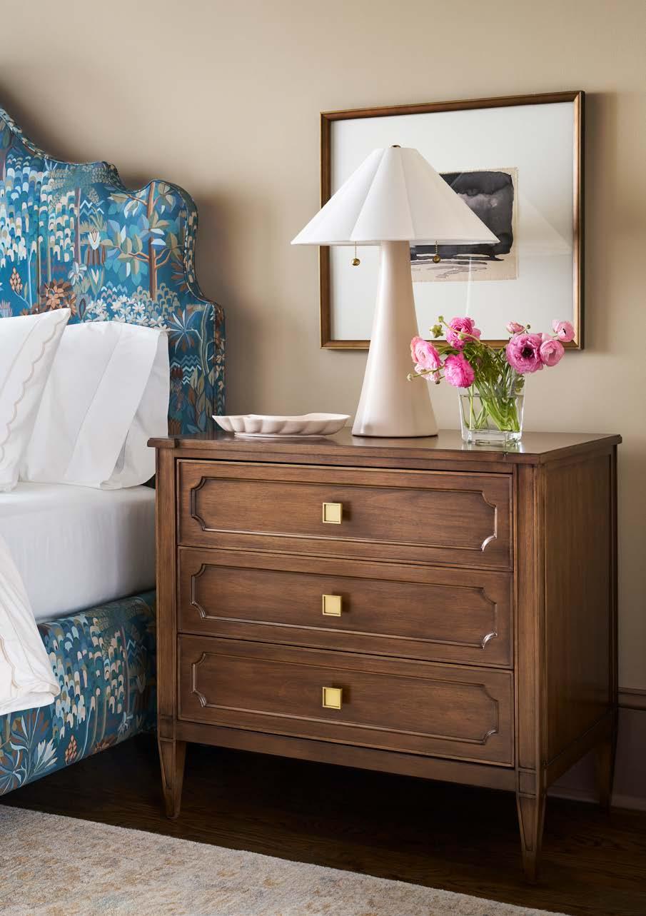 A. LANE KING BED 506CK-PF (Make It Yours Beds) (W 82 D 87 H 66) Fabric: Itilia Camel. Finish: Saddle. Maple Block Legs. B. PALOMA LARGE THREE DRAWER NIGHTSTAND CC213 (Make It Yours Bedroom) (W 40.81 D 20 H 29.5) Finish: Mocha. Beech and Maple Solids and Veneers, Three Drawers, Corduroy Face, Round Ball Pulls in Antique Bronze/One Centered on Each Drawer, No Base Options. All MIY Bedroom drawer faces and hardware options are available. C. MCCARTNEY CHAIR W797-CH (Michael Weiss) (W 31 D 35.5 H 34) Fabric: Fitz Chestnut. Satin Brass Metal Frame (no finish options) D. PALOMA THREE DRAWER NIGHTSTAND CC212 (Make It Yours Bedroom) (W 33.5 D 20 H 28) Finish: Mocha. Beech and Maple Solids and Veneers, Three Drawers, Corduroy Face, Round Ball Pulls in Antique Bronze/One Centered on Each Drawer, No Base Options. All MIY Bedroom drawer faces and hardware options are available. E. PALOMA TALL DRESSER CC210 (Make It Yours Bedroom) (W 75.75 D 22 H 35) Finish: Mocha. Beech and Maple Solids and Veneers, Six Drawers, Outside Bead Face, Round Ball Pulls in Antique Bronze/One Centered on Each Drawer, No Base Options. All MIY Bedroom drawer faces and hardware options are available.