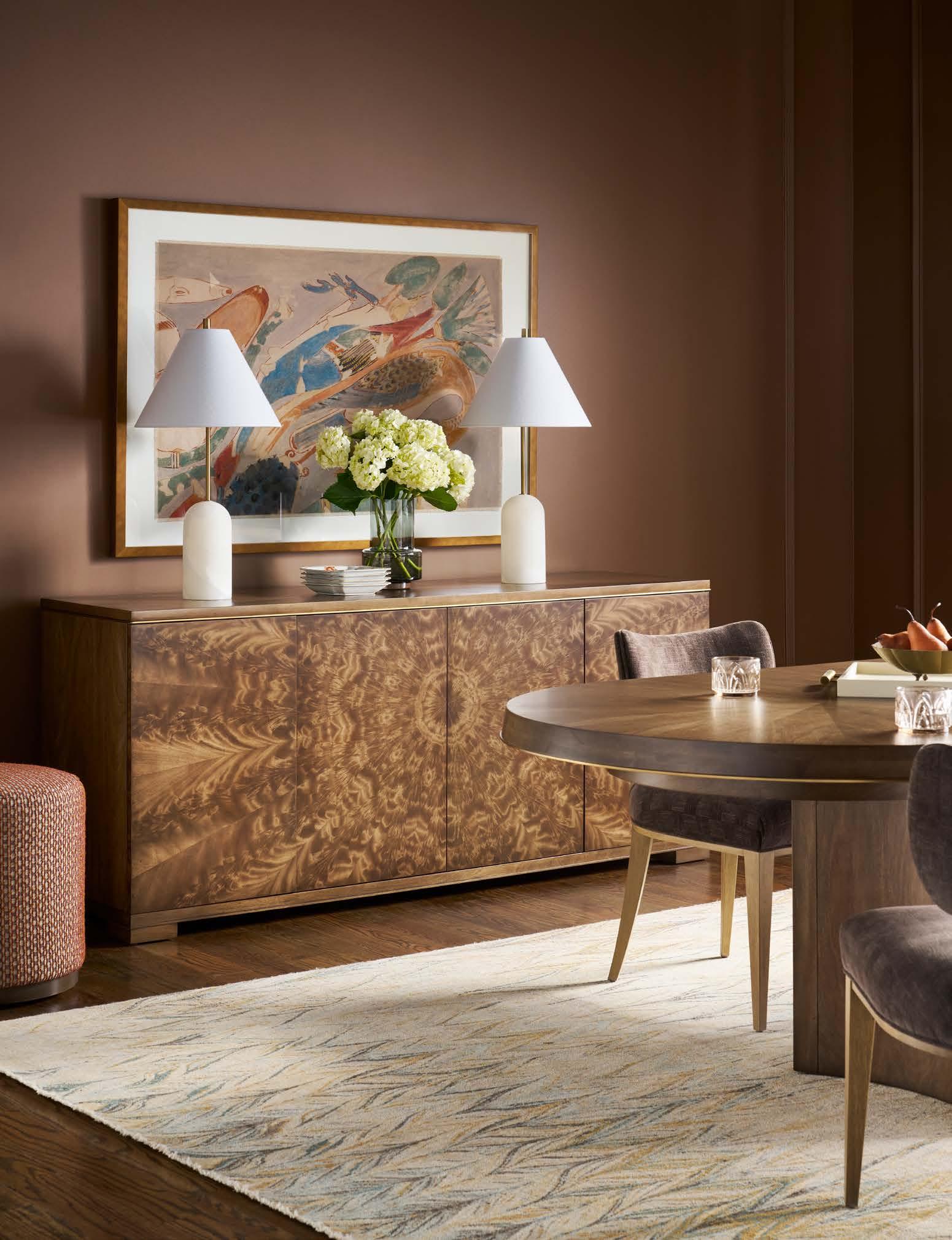 A. HASKELL OTTOMAN W120-OT (Michael Weiss ). (Overall: H 20 Diameter 19) Fabric: Ripley Paprika. Finish: Havana. Maple Base, Hidden Ball Casters in Antique Brass or Brushed Nickel. B. REFLECTION SIDEBOARD 8427B (Stocked) (W 74.25 D 20.25 H 32.25) Finish: Mocha. Bleached Flatcut Mahogany on Top and Sides, Bleached Crotch Mahogany with Radial Match on Doors, Diamond Pattern Veneer on Top, Lacquered Natural Brass Bead Inlay Along the Bottom of the Top Panel, One Adjustable Shelf in Center, One Adjustable Shelf on Left and Right Sides. C. REFLECTION DINING TABLE 8427T-OC (Stocked) . (W 86-126 D 46 H 29.5) Finish: Mocha. Bleached Flatcut Mahogany Solids and Veneers, Oval Top with Two 20” Leaves (shown with one leaf) , Lacquered Natural Brass Bead Inlay Along Bottom Edge of Apron, Two Concave Triangle Pedestals. D. REFLECTION SIDE CHAIRS V357S (2 shown ). (W 20 D 21.5 H 31.75) Fabric: Trendy Chocolate. Finish: Latte. Bleached Mahogany Frame.