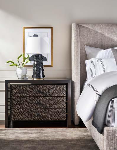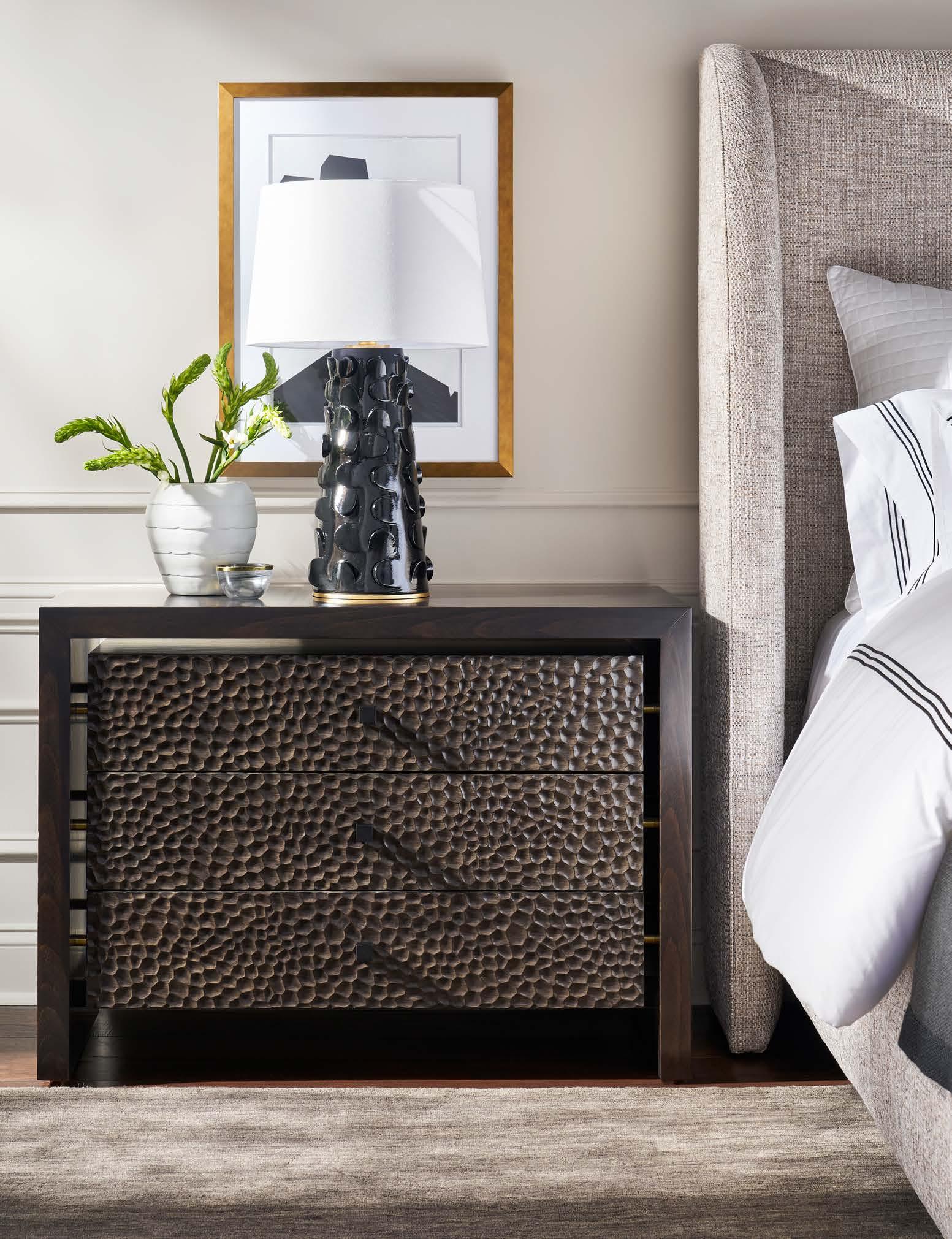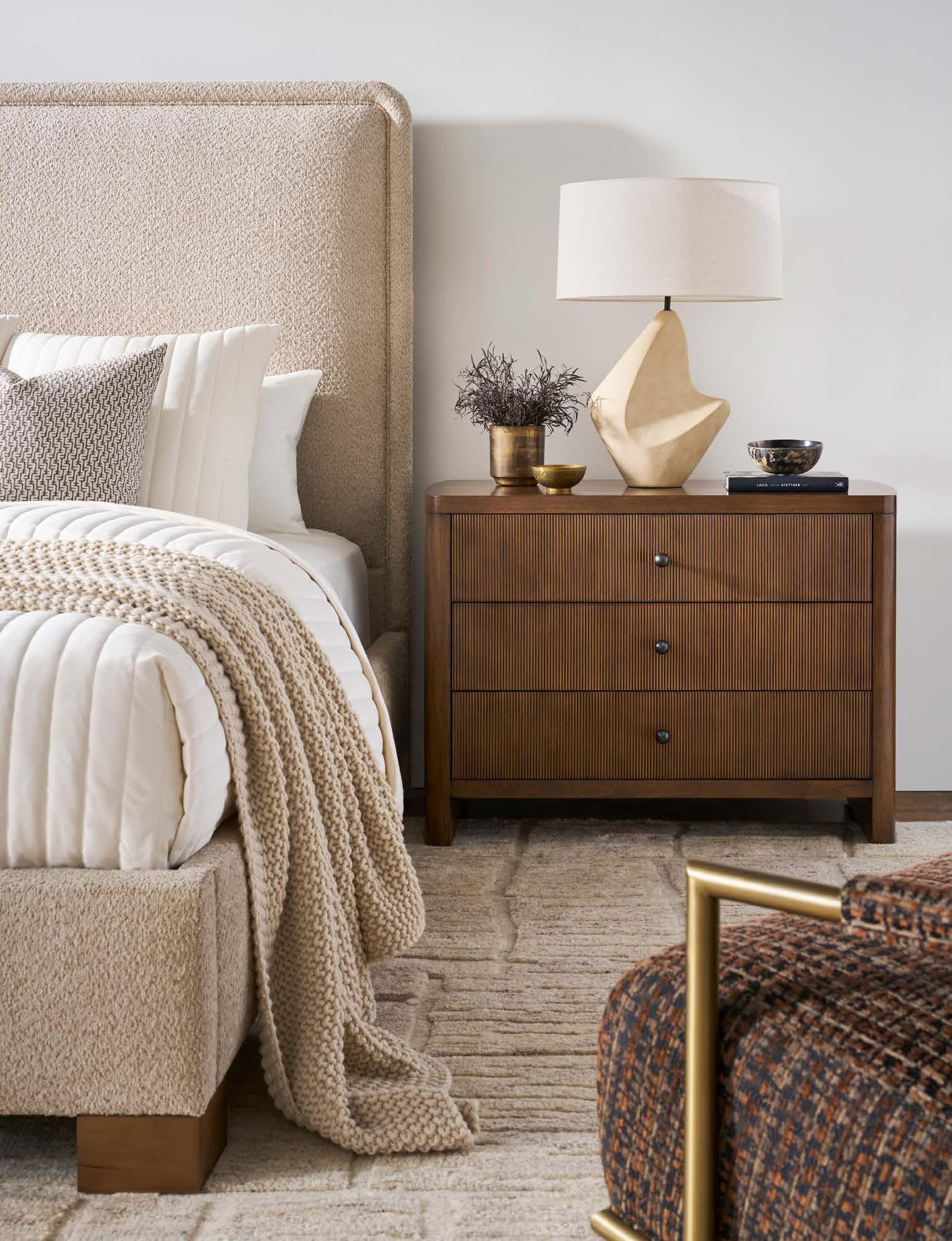 A. DEVON LARGE THREE DRAWER NIGHTSTAND CC243 (Make It Yours Bedroom) (W 41 D 20 H 29.5) Finish: Amarone. Beech and Maple Solids and Veneers, Three Drawers, Premium Carved Face (upcharge) , Namaste Pulls in Antique Bronze/One Centered on Each Drawer, No Base Options, Metal Spacers Between Inner Box and Outer Shell in Antique Bronze (shown) , Brushed Nickel or Satin Brass. All MIY Bedroom drawer faces and hardware options are available. B. BLYTHE KING BED 576CK-PF (Make It Yours Beds) . (W 89 D 88 H 66.25) Fabric: Typical Desert Sand. Finish: Amarone. Maple Block Legs.