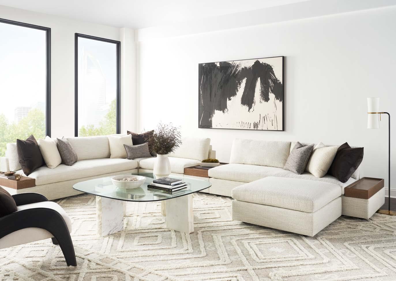 Concrete on Top (upcharge) . Bleached Maple Top and Base. F. MCGHEE OTTOMAN V177-OT. (W 19 D 19 H 18) Fabric: Venita Coffee. Ball Casters in Antique Brass or Brushed Nickel (shown) , Ring Handles in Brushed Nickel. G. SYMMETRY OTTOMAN V240-OT. (W 34.5 D 22.5 H 19.5) Fabric: Toscana Sable. Finish: Amarone. Wood Base. H. SYMMETRY SOFA V240-S. (W 97 D 42 H 34) Fabric: Trendy Ivory; two standard 21" throw pillows in Toscana Sable. Finish: Amarone. White Oak Base. I. SYMMETRY EXTENDED SOFA V240-ES. (W 111 D 42 H 34) Fabric: Trendy Ivory; two standard 21" throw pillows in Toscana Sable. Finish: Amarone. White Oak Base.