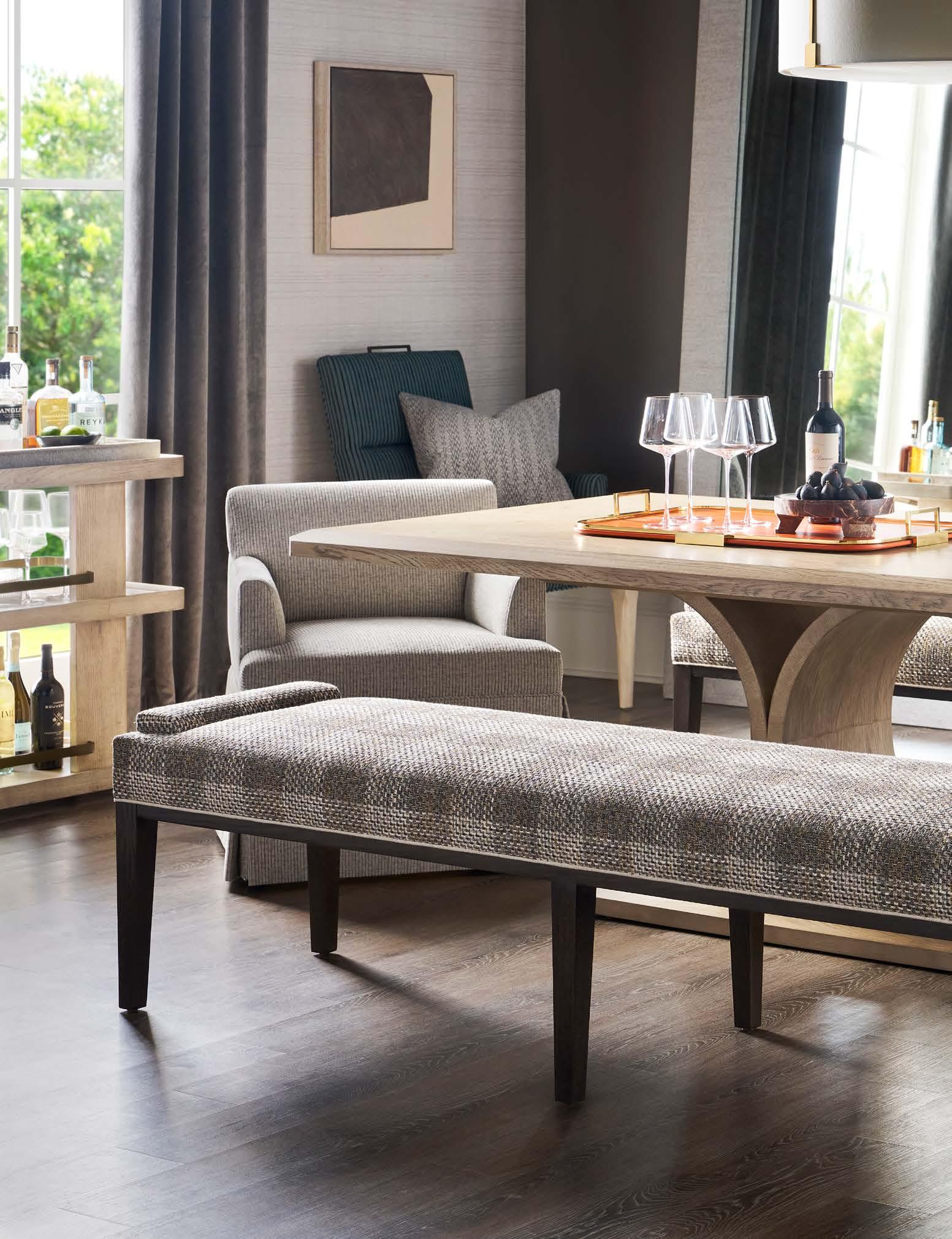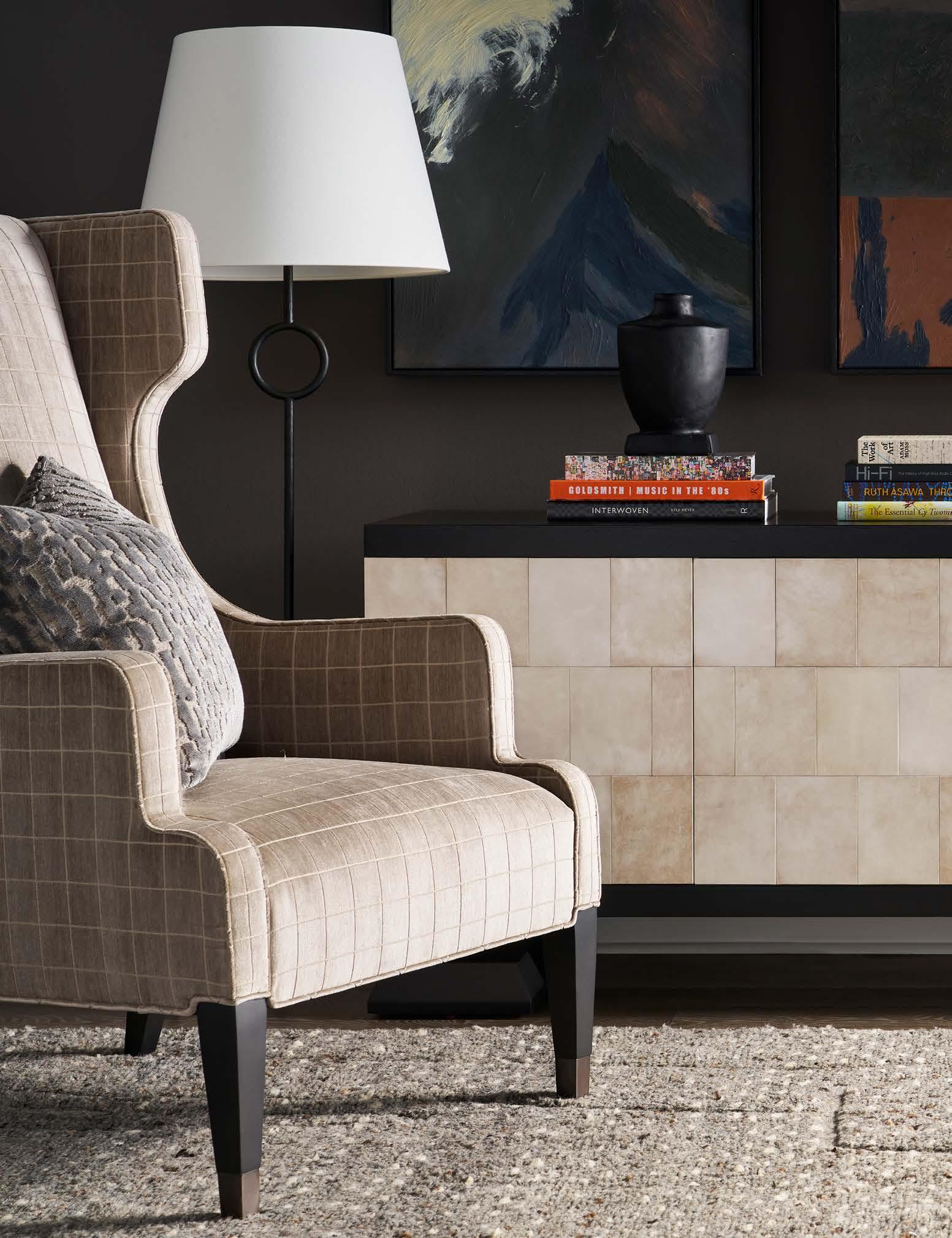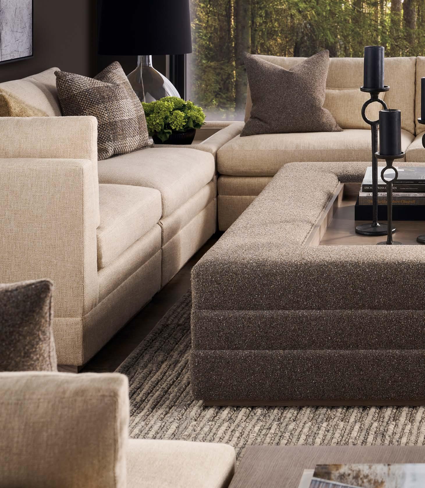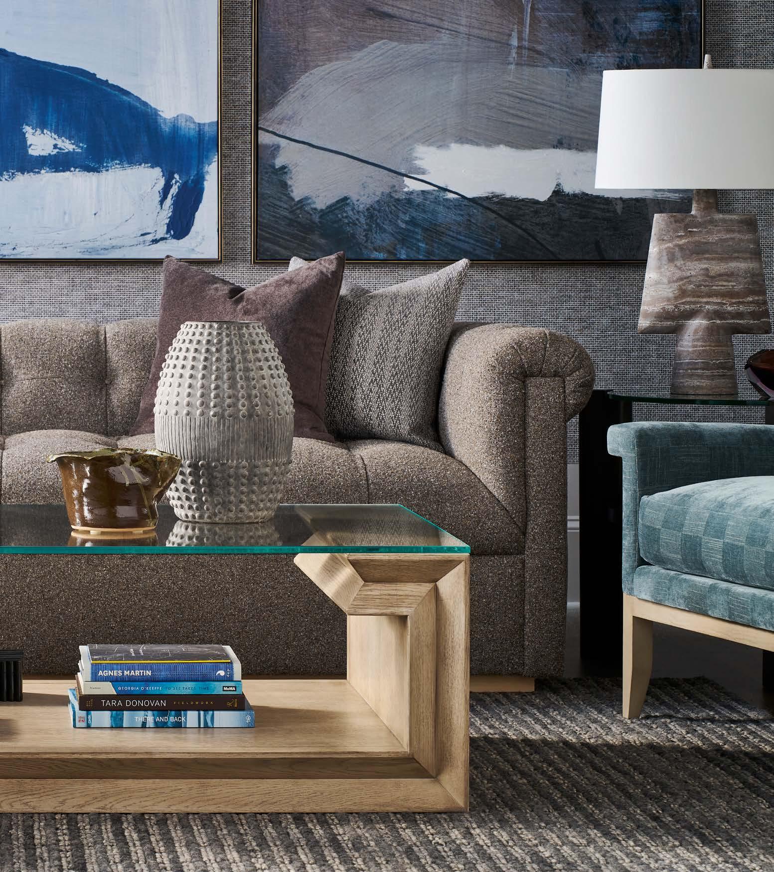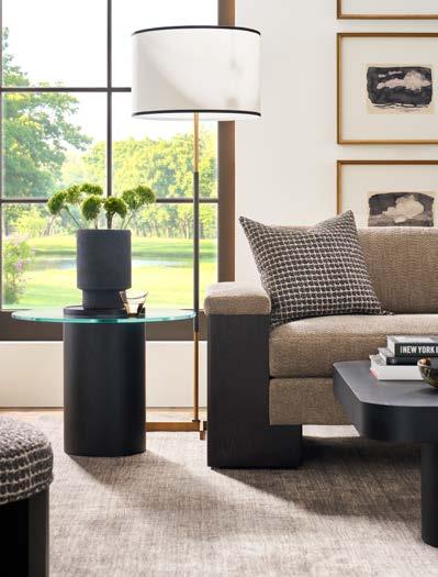 Opposite Page: VERONA COCKTAIL TABLE P377C1. (W 36 D 36 H 16.5) Finish: Silver Briar. Random Match Mappa Burl Veneers on Top and Sides, Black Painted Base. Back Cover : RENDITION ARM CHAIR V1220A. (W 25 D 23.25 H 29.5) Fabric: Maren Mineral. Finish: Cavallo. Bleached Mahogany Frame, Post Caps in Lacquered Natural Brass (shown) or Vintage Silver.