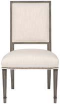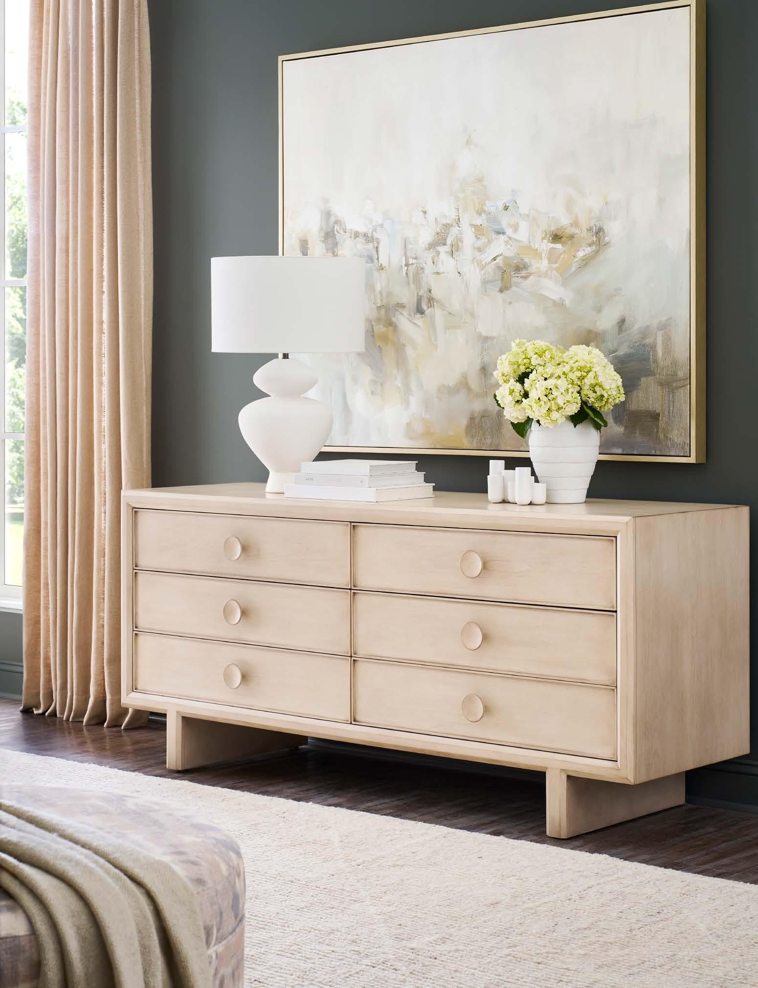 A. DEVON DRESSER CC241 (Make It Yours Bedroom) (W 75.75 D 22 H 32.5) Finish: Amarone. Beech and Maple Solids and Veneers, Six Drawers, Premium Carved Face (upcharge) , Namaste Pulls in Antique Bronze/One Centered on Each Drawer, No Base Options, Metal Spacers Between Inner Box and Outer Shell in Antique Bronze (shown) , Brushed Nickel or Satin Brass. All MIY Bedroom drawer faces and hardware options are available. B. SYMMETRY CHAIR V240-CH. (W 43 D 42 H 34) Fabric: Toscana Sable. Finish: Amarone. Wood Base. C. EMBER SPOT TABLE P581EE (Stocked) (W 14 D 14 H 22) Flint Tinted Glass.