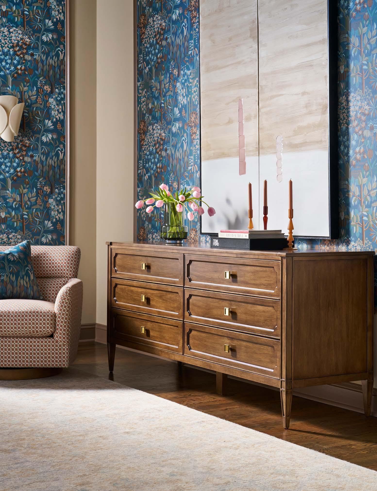 A. GEORGIANNA SWIVEL CHAIR V1235-SW. (W 31.5 D 32 H 31.5) Fabric: Charles Sunset. Finish: Latte. White Oak Base, 360 Degree Swivel. Shown with one extra MPSP21 pillow in Sally Mineral (additional charge) B. PERRY DRESSER CC231 (Make It Yours Bedroom) (W 74.25 D 22 H 32.75) Finish: Mocha. Beech and Maple Solids and Veneers, Six Drawers, Clip Corner Face, Small Wallace Pulls in Satin Brass/One Centered on Each Drawer, No Base Options. All MIY Bedroom drawer faces and hardware options are available.