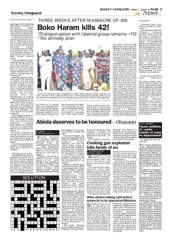 true citizens”. ’President never mentioned amnesty for Boko Haram’ Also, yesterday, Abati said President Goodluck Jonathan never mentioned the issue of amnesty for Boko Haram members during his Democracy Day speech. The presidential adviser was reacting to the statement by the Minister of Youths Development, Haruna, on Thursday, during one of the events marking the Democracy Day celebrations, that government would grant amnesty to Boko Haram members who renounce violence and lay down their arms. Abati, who spoke with State House correspondents, said the President never mentioned amnesty in his Democracy Day broadcast. Chibok girls: Ozekhome backs negotiation Meanwhile, a Senior Advocate of Nigeria (SAN) and human rights activist, Chief Mike Ozekhome, has called on the Federal Government to negotiate with Boko Haram with a view to bringing back the Chibok abducted school girls. In a statement, yesterday, Ozekhome, who is also a delegate to the National Conference in Abuja, said that Section 14 of the 1999 Constitution mandates the Federal Government to ensure the security and welfare of the citizenry.