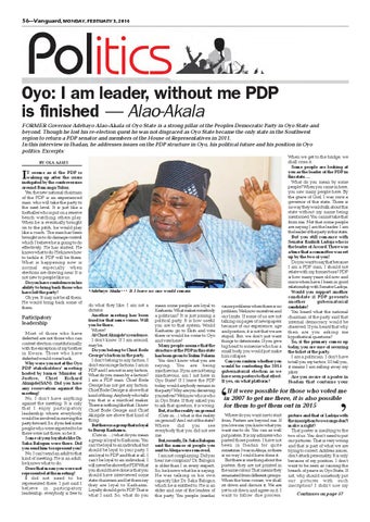Oyo: I am leader, without me PDP is finished — Alao-Akala FORMER Governor Adebayo Alao-Akala of Oyo State is a strong pillar of the Peoples Democratic Party in Oyo State and beyond. Though he lost his re-election quest he was not disgraced as Oyo State became the only state in the Southwest region to return a PDP senator and members of the House of Representatives in 2011. In this interview in Ibadan, he addresses issues on the PDP structure in Oyo, his political future and his position in Oyo politics. Excerpts: BY OLA AJAYI