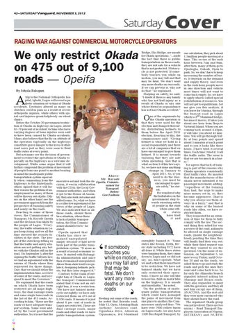 trip to the National Orthopedic hos pital, Igbobi, Lagos will reveal a pa thetic situation of victims of Okada accidents. Destinies altered as many on clutches cried in pain as a result of severe orthopedic injuries, while others with spinal cord injuries groan helplessly on wheel chairs. Before the October 20 government restriction of Okada on highways in Lagos, about 65-70 percent of accident victims who have varying degrees of bone injuries were said to have been caused by Okada accidents. Many also believe that the fly-on attitude of the operators especially on the highways constitute grave danger to the lives of other road users just as they were seen to flout traffic rules at every point. But not many see the decision of government to restrict the operations of Okada especially on the highways as a welcome development. While some argue that it will further compound the problem of movement of people from one point to another bearing in mind the inadequate public Above: transportation system especialMr. Kayode ly when commuting from the executive sat and took the dehighways to the hinterlands; cision, it was in collaboration Opeifa, Commissioner for others opined that it will fur- with the CDAs, the Local GovTransport. ther worsen the problem of un- ernment authorities, and when Below: employment as many of them it got to the House of AssemGov Fashola will be thrown out of jobs. Oth- bly, they also took out some and ers on the other hand see the added some. So, what we have government approach from the is a collective agreement of the perspective of ensuring safety views of the people of Lagos. and sanity on the roads. We also indicated that in all Reacting to some of these these roads, should there views, the Commissioner of be a situation, where there Transport, Mr. Kayode Opeifa is lack of public transporsaid the decision was taken by tation, the Hon Commisthe people of Lagos. “Every- sioner should review,” he day, the traffic situation in La- stated. gos keep rising and we all the Opeifa opined that time stressed the security fa- Okada has since recilities in the state. The peo- mained unregulated ple of the state keep telling us simply because it had never that the traffic and safety situ- been part of the public transation are not getting any bet- portation system. “It arose as ter with the Okadas still on the a result of social economic isroad. On September 5, after the sues. It started with Babangisigning the traffic bill into law, da administration and since we had an agreement with the then it remained unregulated. unions of Okada where they Akwa Ibom state tried to regurequested for three things. late it, designing helmets, jackOne, that we should delay the ets, but they later stopped it.” implementation time, a review Contrary to the claim of outof some of the roads; and a re- right ban of Okada in Lagos, quest to meet the Governor.” the transport Commissioner He explained that the roads stated that it was not an outon which Okada have been right ban, it was a restriction. restricted are all major high- “We have not banned motorways, the dual carriage roads cycle out rightly; we have only and some single lane roads in restricted them on 475 out of the list of the 475 roads. Ac- 9,100 roads. It means it is just Reeling out some of the roads, cording to him, “these are the about 6 per cent of roads in he noted that Ikorodu road, roads we have adequate trans- Lagos are restricted. These are Mile 12, Ojota, Mobalaji Bank port system. Some were add- dual carriage roads, major Anthony, Awolowo road, ed by the Local government roads and other roads we have Ogunlana drive, Adeniran authorities. So, it is not that the public transportation system. Ogunsanya, 3rd Mainland