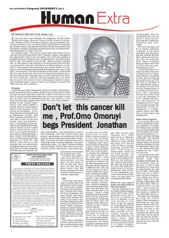 t was sad news last Monday for indigenes of Edo State, when the former Director General of the Center for Democratic Studies (CDS), Prof Omo Omoruyi, declared that his cancer has resurfaced. He was flown to the United States of America for another round of treatment but before he left, he pleaded with President Goodluck Jonathan and his former boss, President Ibrahim Babangida to come to his aid. According to him, “My cancer is back and I don’t know how it will end, the governor of the state Comrade Adams Oshiomhole has graciously come to my aid again. He is the one making it possible for me to commence my second journey. You know in my book I said “My journey back to life”, that is journey number one. It will appear I am starting a second journey but how this second journey will end, I don’t know. So this weekend, on Saturday, I am going to the hospital in the United States, to commence a new treatment plan and that treatment plan, how it will end, I do not know. You will recall that in the book, I said in the life of a cancer survivor, there are two fears: fear number one is the fear of recurrence that the cancer could come back, fear number two is that one could die. The fear number one is no more fear, it is real. My cancer is back which means I have to start a new treatment plan, I have to start a new journey because the other one was also a journey. Weeping I cried because since September, when I went the United States in the hospital for three weeks, all the series of tests showed that my cancer is back ,that the recurrence is more a fear but it is now real. It is back and therefore there has to be a new plan to treat Prof Omo Omoruyi..My cancer is back and I don’t know me. So, there are two alternatives for me. One, there is a new how it will end drug that has been approved by FDA, Food and Drug Administration in the United States which costs about $9000 a month, but you cannot take it unless in the presence of the doctor an oncologist. It is a drug that was just introduced in September. Luckily, with what comrade provided me, I was able to buy for the first month. I have not started using it. I am going to start using it in the hospital this weekend in Boston in the United States. If that doesn’t work, I have to go again through a ams Oshiomhole, I am going back to start a no more fear of resurnew kind of chemotherapy. I new treatment. The end, I don’t know, that gence, fear of recur- ple. They are the ones know what I went through be- means I am starting a second journey, the first rence, it has recurred, it running ACN. What fore, so if the second fear then journey, Back to Life, that book is there, hope- is real...fear of death, must he do, I will leave happens, if I then die, who fully, it will also be back to life because if you that one is for God, I am that to time but he knows, I don’t know...so I am look at the book, it clearly said that I was guar- a Christian and I have should try and rebuild starting this two alternative anteed five years . So, when I started noticing always believed that that the party ACN but not treatment plans for an end I some problems, I knew that well, it is not un- is how it ends. There is with all these people don’t know. So this weekend, usual so maybe who knows, God in His infi- nothing you can do about hanging around him now. I don’t want to with the help of Comrade Adnite mercies would grant that. For a cancer survi- name names. These are vor, death is the ultimate no good people, all me another five years. For those who want to but I don’t want to suf- these people left over come to my aid, this is a fer. With what I went from Lucky Igbinedion, knew journey, so if you through before, it is an they are not good peodon’t see me again, if agonising moment for ple. There are good peothe second fear takes me that I am going to go ple who are not in poliplace, if I die, then you through all that again in tics now, who really have know where I am. But a different way. You can track record of accomkeep praying for me that see my agony, so I don’t plishment and service in this second journey, I want to suffer but I have to our community. Bebeen suffering in differ- cause of the future of this will also come back. ent ways in the past one state, we may have a month. I can’t help but monumental problem. IBB I sent him a text mes- still say think you Comsage yesterday that I am rade Adams Oshiom- What do you expect going back to the hospi- hole. Whatever happens, from your state (Edo) in tal. I have also contact- I pray for him that under the near future? We are supposed to be ed some of my good peo- him, and with him, this ple; General and Sena- State should find a di- in South-South dominattor Daisy Danjuma, Mrs rection. I wish I could ed by PDP. Is he a PDP Ama Pepple and many help him more than that; man? He is ACN, but is other kind people who those who he will put in he ACN of Tinubu or came to my aid at vari- government to help him ACN of Ribadu, is he ous times during my first will be those that will ACN Yoruba or ACN journey; the likes of Pro- help this State find a di- Edo? To me, he should fessor Tunde Adeniran, rection in this country do everything possible to work with Jonathan Professor Tunde Rahma, called Nigeria. I can see a lot of prob- and you know clearly Professor Tunde Makanjuola, Professor A. B. Ya- lem in future but he is a that is not the ACN dihaya, Professor Osayuki nice man. It is not be- rection. Outside, this Oshodin and my rela- cause he is helping state will suffer but we me...he loves his people, don’t know what tions. I have been crying here he loves the state but un- Jonathan’s party will be for two weeks now but I fortunately, all these because my good friend have let them know that people he gathered from E. K. Clark is trying to my cancer is back. It is PDP are not good peo- put together all these