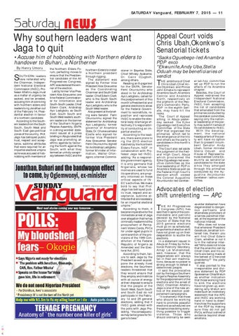 the Northern Elders Forum, perfecting moves to ensure that the Presidential candidate of the All Progressives Congress, APC was declared the winner of the election. Led by former Vice President Alex Ekwueme; one time Federal Commissioner for Information and South-South Leader, Chief Edwin Clark; Arcbishop Ayo Ladigbolu as South East, South South and South West leaders, southern leaders on the banner of the Southern Nigeria Peoples Assembly, SNPA in a strong worded statement issued at a press briefing in Abuja noted that Jega was promoting an ethnic agenda by favouring the North against the South, with what they termed an unholy conspiracy between INEC and the