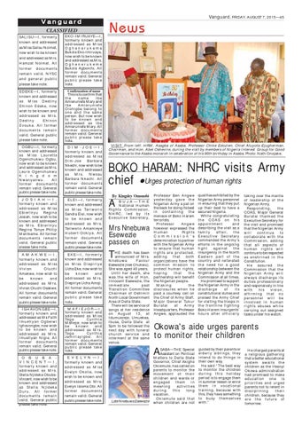 O B U B A VINCENT— I , formerly known and addressed as Mrs. Stella Njideka ObubaVincent, now wish to be known and addressed as Stella Njideka Duru. All former documents remain valid. General public please take note.