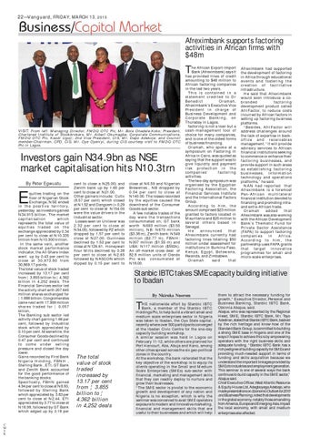 quities trading on the floor of Nigerian Stock Exchange, NSE ended in the positive territory, yesterday as investors gained N34.915 billion. The market capitalisation which represents the total value of equities traded on the exchange appreciated by 0.34 per cent to close at N10.335 trillion from N10.300 trillion. In the same vein, another stock market performance indicator, the All Share Index went up by 0.43 per cent to close at 30,973.80 from 30,869.17 points. The total value of stock traded increased by 13.17 per cent from ¦ 3.855 billion to ¦ 4.362 billion in 4,252 deals. The Financial Services sector led the activity chart with 207.645 million shares exchanged for ¦ 1.888 billion. Conglomerates came next with 17.999 million shares traded for ¦ 0.057 billion, The Banking sub sector led activity chart gaining 1.66 per cent, followed by Industrial stock which appreciated by 0.10 per cent. Meanwhile, the Consumer Goods declined by 0.47 per cent and continued to come under selling pressure and closed the day lower. Gains recorded by First Bank Nigeria Holding, FBNH , Sterling Bank , ETI, GT Bank and Zenith Bank accounted for the good performance of the banking stocks. Specifically, FBHN gained 4.94 per cent to close at N8.93, followed by Sterling Bank which appreciated by 3.83 per cent to close at N2.44. ETI appreciated by 3.77 to close at N18.99, followed by GT Bank which edged up by 3.18 per