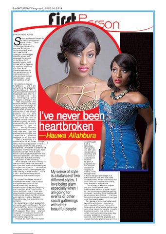 I’ve never been heartbroken — Hauwa Allahbura even though I am a Christian, my parents are still very conservative and they did not know or understand that the Miss FCT pageant did not involve •Hauwa Allahbura any sort of display of nudity. They thought that without necessarily giving you an I would be going on stage in a ultimatum or directly asking for sex bikini and all that and that idea in exchange for getting a job. I irritated them. When they found out think that will always be there that it did not involve any nudity , because it is how men are , they started to support me. especially in this country. The other You know it’s weird or maybe level is where I get really angry not, but I have never been .When someone tries to force you heartbroken before. Maybe I enjoy into sleeping with them just to do the dumping before getting because they want to do something dumped. I actually think heartbreak for you or because you are asking is an option and I think it’s time for a job. When it comes to that, I for girls to know their worth and get would say women have a choice over the heartbreaks. and that choice is to maintain their My sense of style is a balance of personal integrity and say a big no. two different styles. I love being Some upcoming talents may be glam especially when I am going desperate for a breakthrough in for events or other social gatherings with other beautiful people. I love to their career and they may decide that they have no choice other than be glamorous in that sense, but to sleep with the person, but I do when I am just doing my every day not believe in that. I believe in grocery shopping or running taking the long route to success around, I don’t think anybody will through hard work and persistence. expect me to be glamorous, so I like