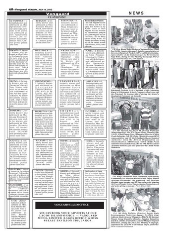 VANGUARD'S LAGOS OFFICE YOU CAN B O O K Y O U R A D V E R T S AT OU R L A G O S I S L A N D O F FI C E — VA N G U A R D MEDIA LIMITED (LAGOS OFFICE) K I O S K 4 8 E A S T P AV I L I O N T B S , L A G O S .