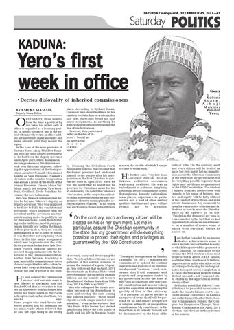 RDINARILY, three months from the time a political fig ure takes his or her oath of office is regarded as a learning period. In media parlance, this is the period when newly sworn-in office holders are allowed to make mistakes and make amends until they master the ropes. In the case of the new governor of Kaduna State, Alhaji Mukhter Ramalan Yero, he is not new to government as he had been the deputy governor since April 2010, when his immediate late predecessor, IbrahimYakowa took over the reins of power, following the appointment of the then governor, Architect Namadi Mohammed Sambo as Vice President. Namadi’s elevation to the number two position was also as a result of the death of the former President Umaru Musa Yar ’ Adua, which led to then Vice President, Goodluck Ebele Jonathan becoming the new helmsman. Yero was finance commissioner before he became Yakowa’s deputy. As deputy governor, Yero was supposed to be there to fulfil the constitutional provisions which stipulate that the president and the governors must appoint running mates to qualify to run for their elections. Aside from fulfilling such conditions, most deputy governors literally see hell in the hands of their principals as they are usually marginalised in the scheme of things. It was therefore not surprising when Yero, in his first major assignment which was to preside over the valedictory session for his boss, late Governor Patrick Ibrahim Yakowa expressed disappointment with the behaviour of the commissioners he inherited from Yakowa. According to him, most of the commissioners never showed respect for his office when Yakowa held sway at Kashim Ibrahim House, the seat of power in the state.