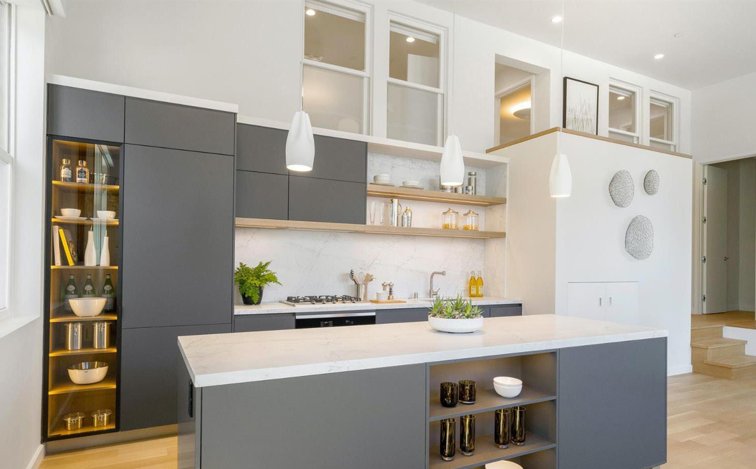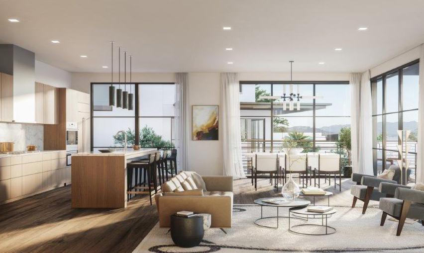 Features & Finishes: European custom kitchen system in stone textured finish, panel-ready refrigerators, integrated LED cabinet lighting, Engineered Quartz slab countertop, natural gas range, wide-plank wood-textured porcelain tiles, engineered European wood floor, Latch Smart Lock System