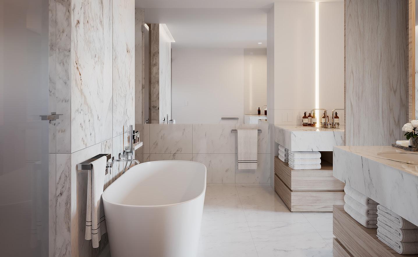 Features & Finishes: Contemporary finishes with a European flair. Kitchens with fully integrated refrigerators and dishwashers. Bathrooms with glass-enclosed showers, double vanities and designer tile floors and walls