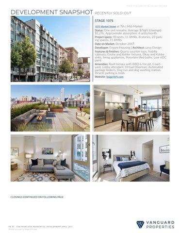 Status: One unit remains, Average $/SqFt (closings): $1,276, Approximate absorption: 4 units/month Project specs: 90 units, 11 BMRs, 8-stories, 23 parking spaces, 11 BMRs Date on Market: October 2017 Developer: Encore Housing | Architect: Levy Design Features & Finishes: Quartz counter tops, Nobilia cabinets, Grohe and Kohler fixtures, Elkay and Kohler sinks, Smeg appliances, Porcelain tiled baths, Low VOC paint Amenities: Roof terrace with BBQ & fire pit, Courtyard, Lobby attendant, Virtual Doorman, Automated package lockers, Dog run and dog washing station, Bicycle parking & tools Website: Stage1075.com