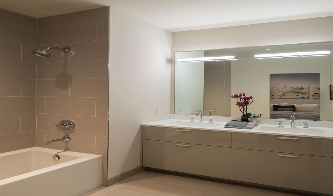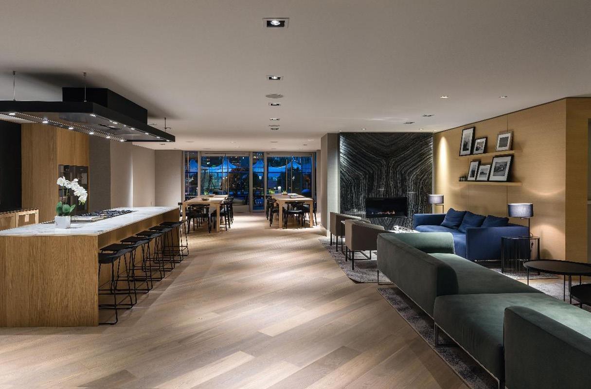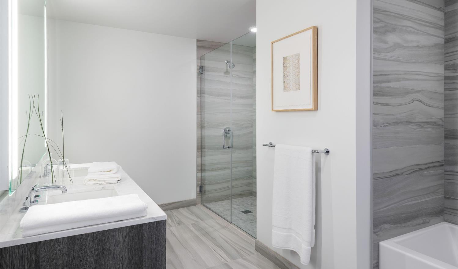 Features & Finishes: Citterio M Collection fixtures by Hansgrohe Axor, Bespoke cabinetry in light ash wood, Quartz slab countertops by Silestone, Designer appliance suite by Bosch, Integrated LED lighting by Core Lighting, Wide Plank European White Oak hardwood flooring by Pravada, Touchless entry system by Latch