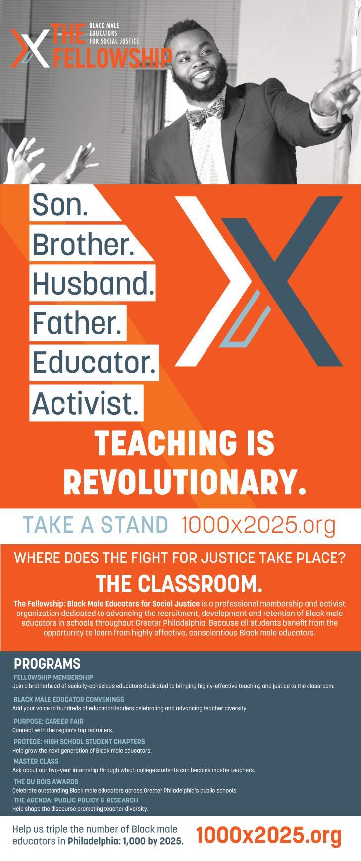 The Fellowship is a professional membership organization dedicated to advancing the development, recruitment and retention of Black male educators in Philadelphia’s public schools. Founded in 2014, the Fellowship was borne out of a need to inspire Black men to achieve social justice they seek by teaching and continually supporting each other’s aspirations. Our work began after young Black male educators who were considering leaving the profession, reached out to our founders for assistance, counsel, and guidance.