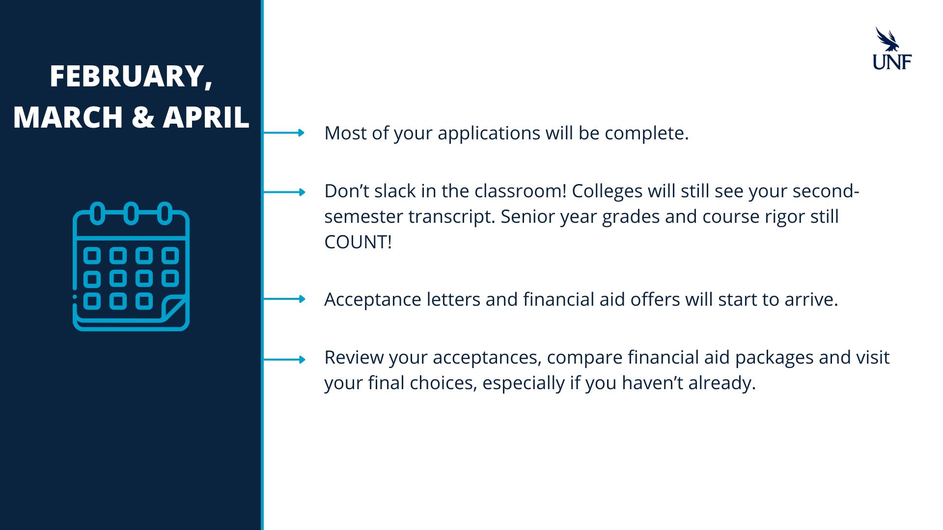 • Complete the Florida Financial Aid Application (FFAA) during senior year of high school beginning October 1, but no later than August 31 after high school graduation