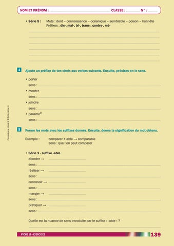 • Série 1 - suffixe -able aborder → ........................................... sens : ............................................................................................................................................. réaliser → ........................................... sens : ............................................................................................................................................. concevoir → ........................................... sens : ............................................................................................................................................. manger → ........................................... sens : ............................................................................................................................................. pratiquer → ........................................... sens : ............................................................................................................................................. Quelle est la nuance de sens introduite par le suffixe « -able » ? ........................................................................................................................................................ FICHE 19 · EXERCICES